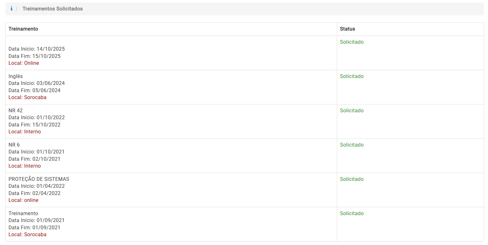 Também temos a categoria "Campos da Solicitação de Treinamento":