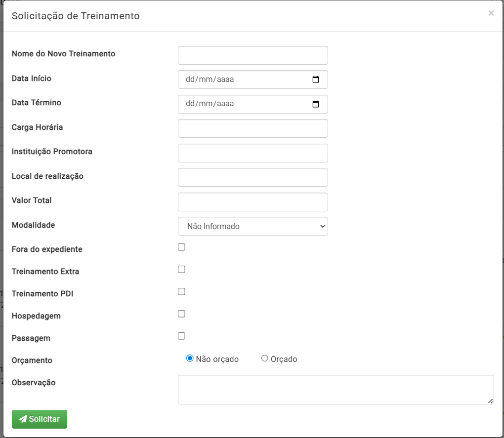 Solicitação de Treinamento Simplificada: Quando selecionado, sistema não irá exigir os detalhes da solicitação de treinamento.