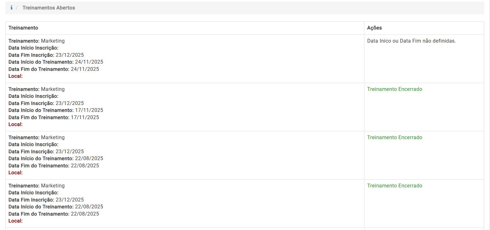 Label Valor Total: Refere-se ao texto ou nome atribuído ao campo que mostra o "Valor Total" associado ao treinamento ou evento, incluindo todos os custos. Fundamental para controle orçamentário e análise de custo-benefício das atividades de desenvolvimento.