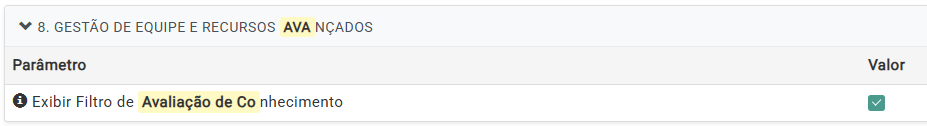 Exibir Filtro de Avaliação de Conhecimento: Quando selecionado, indica que o colaborador terá acesso ao filtro na tela de Avaliação de Conhecimento no HUB.